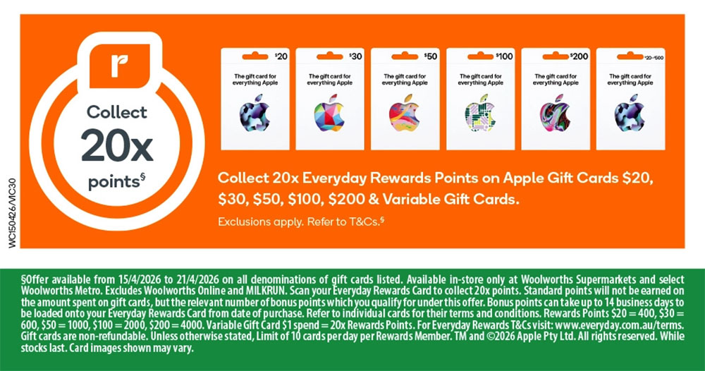 The gift card offer at Woolworths for 15 Apr to 21 Apr 2026 is 20x Everyday Rewards points per dollar spent on all denominations of Apple gift cards.